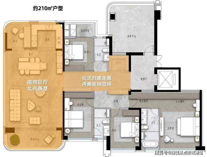 主力户型涵盖建面约 90㎡、120㎡、140㎡、170㎡及 210㎡五大面积段,均为云幕平层设计。其中,90㎡小户型做到三房两卫全南向设计,在珠江新城辐射范围内极为罕见,大幅降低了高端板块的入门门槛;210㎡大户型采用横厅设计,客厅面宽达 7.8 米,搭配 25% 占比的超大阳台,视野开阔,尽显豪宅气度。在使用率方面,项目阳台占比可达 25%,使用率突破 120%,处于全市豪宅第一梯队,考虑到广州即将严控高使用率产品审批,保利天曜或将成为此类产品的 “绝版”。